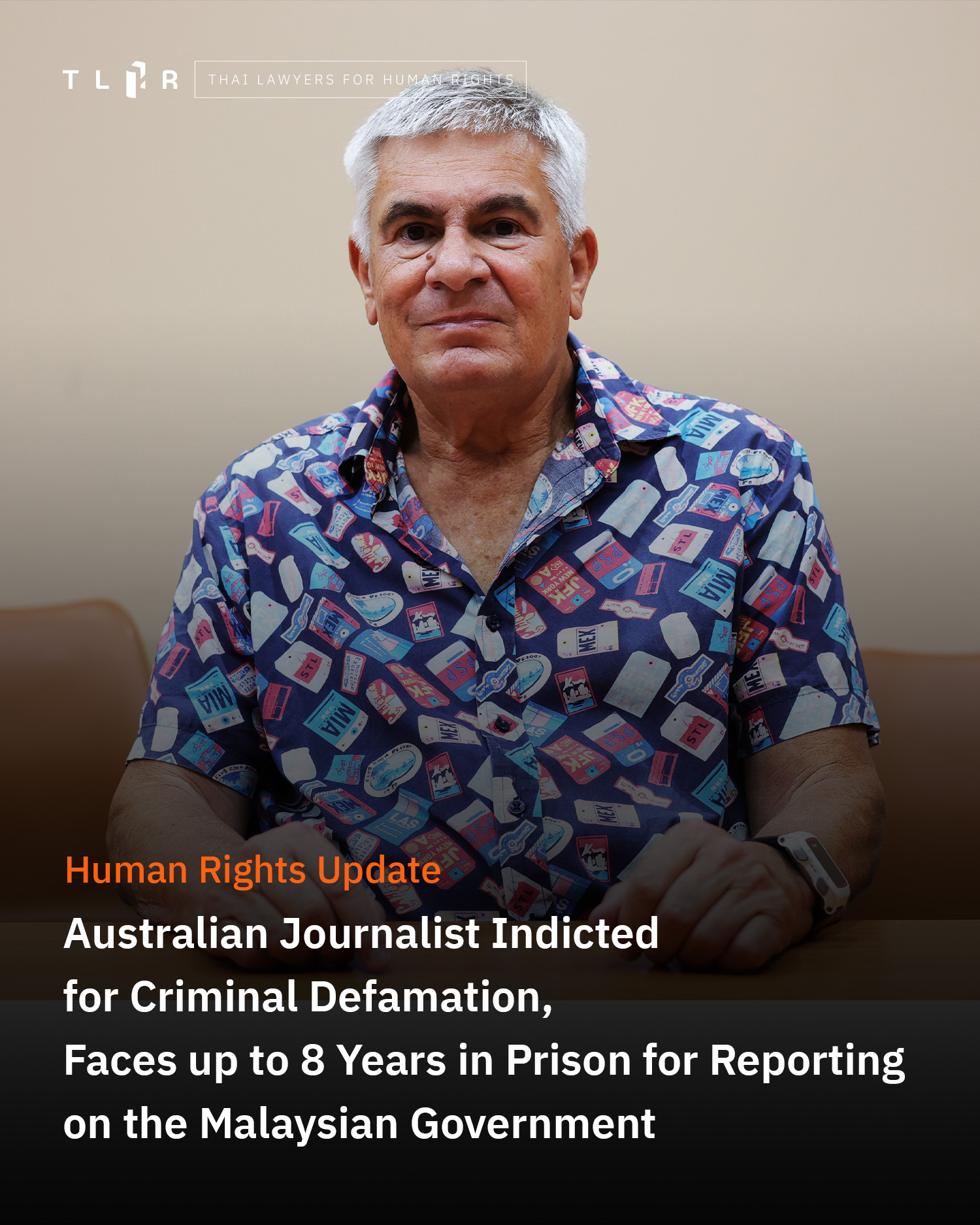Thai Lawyers for Human Rights urgently calls your attention to the indictment of Mr. Murray Hunter, an Australian journalist residing in Thailand, under Section 328 (defamation by publication) of the Thai Criminal Code [1] on 17 November 2025. (Black Case No. Aor. 2120/2568) This case stems from four articles that were published on his Substack between 13 and 29 April 2024, that, according to the public prosecutor, allegedly defamed the Malaysian Communications and Multimedia Commission (MCMC), a Malaysian government agency. If convicted, Mr. Hunter faces a maximum prison term of eight years and a fine not exceeding 800,000 baht.